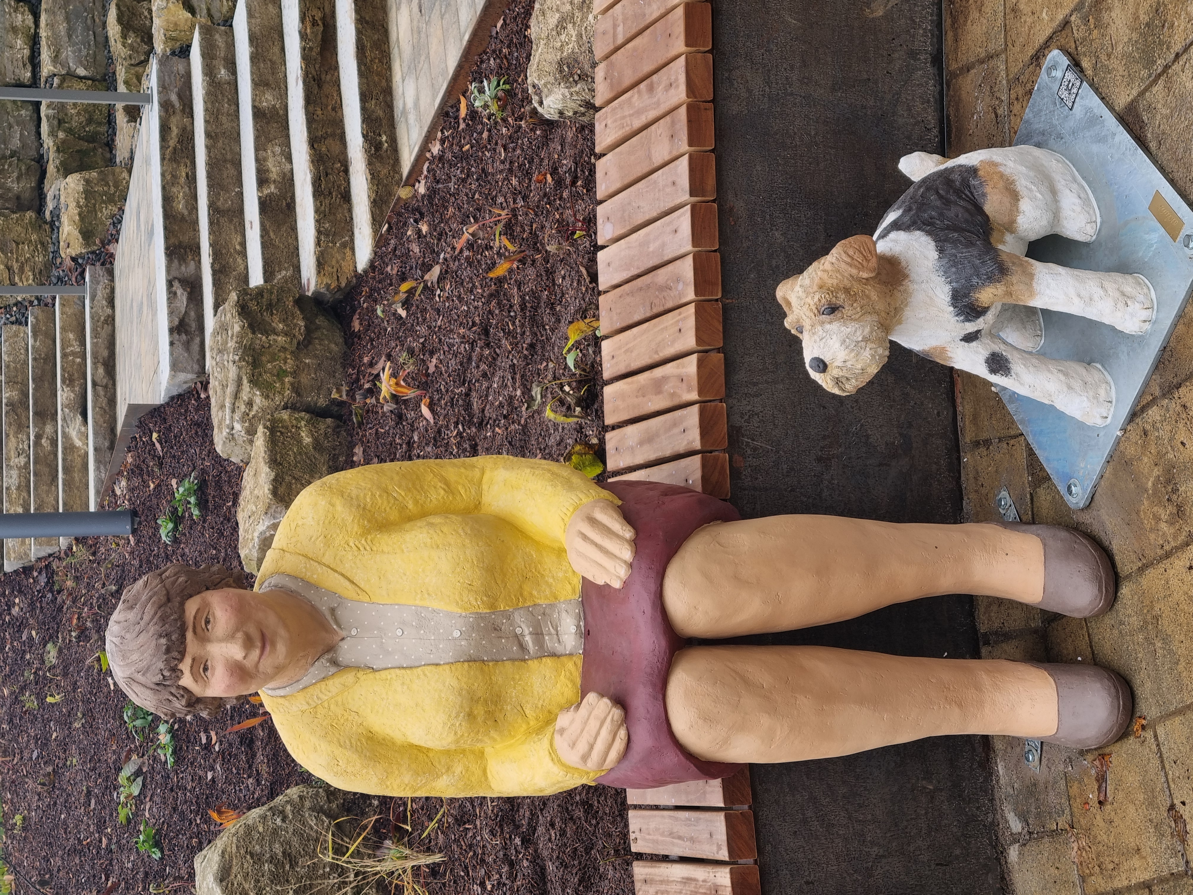 Das Arrangement umfasst eine auf einer Bank sitzende ältere Person mit einem kleinen Hund zu ihren Füßen. Das besondere Detail: Der Korb auf den Knien der Figur sowie die Gefäße neben der Bank können je nach Jahreszeit mit Früchten, Blumen und anderen Dekorationen gefüllt werden.