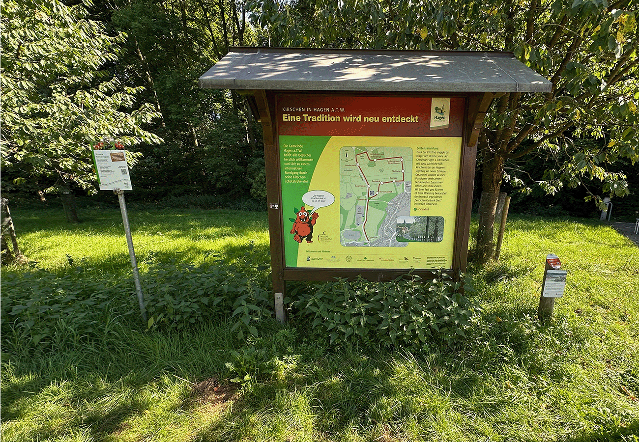 Die Gemeinde Hagen a.T.W. verfügt über die größte Süßkirschensammlung Deutschlands. Rund 360 Bäume bilden ein buntes Sammelsurium verschiedenster alter Sorten, die alle mehr oder weniger stark vom Aussterben bedroht sind. Neben der ökologischen Funktion des Erhalts dieser Arten, zieht der Kirschlehrpfad überregional gerade zur Blüte- und Reifezeit zahlreiche Gäste an.